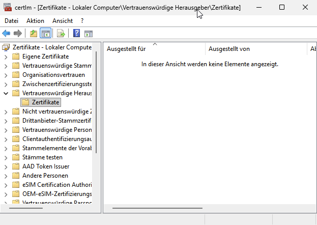 11. Nachdem das Zertifikat erfolgreich importiert wurde, öffnen Sie den Terminal auf Ihrem Windows System mit "**Windows**" + "**R**". Öffnen Sie die **certlm.msc** im Ausführen Fenster und navigieren Sie erneut zu **Vertrauenswürdige Hersteller/Zertifikate**. Hier finden Sie nun das importierte Zertifikat.