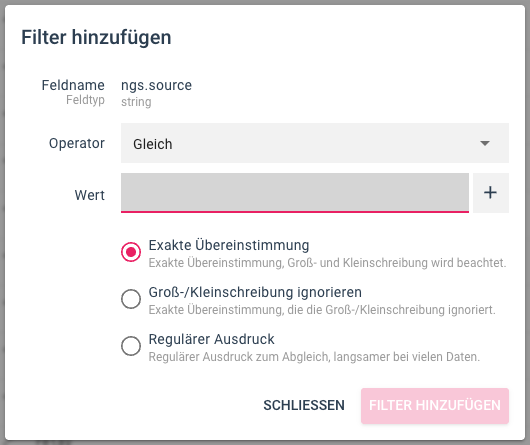 Weiterhin können Sie durch Klick eines Feldes im Datalake weitere Filter hinzufügen. Wählen Sie unter Operatoren, ob für das ausgewählte Feld in Ihrem Filter: Gleich, Ungleich, existiert oder existiert nicht, zutrifft. Aktivieren Sie bei Bedarf die Volltextsuche oder passen Sie den Wert Ihres Feldes manuell an.