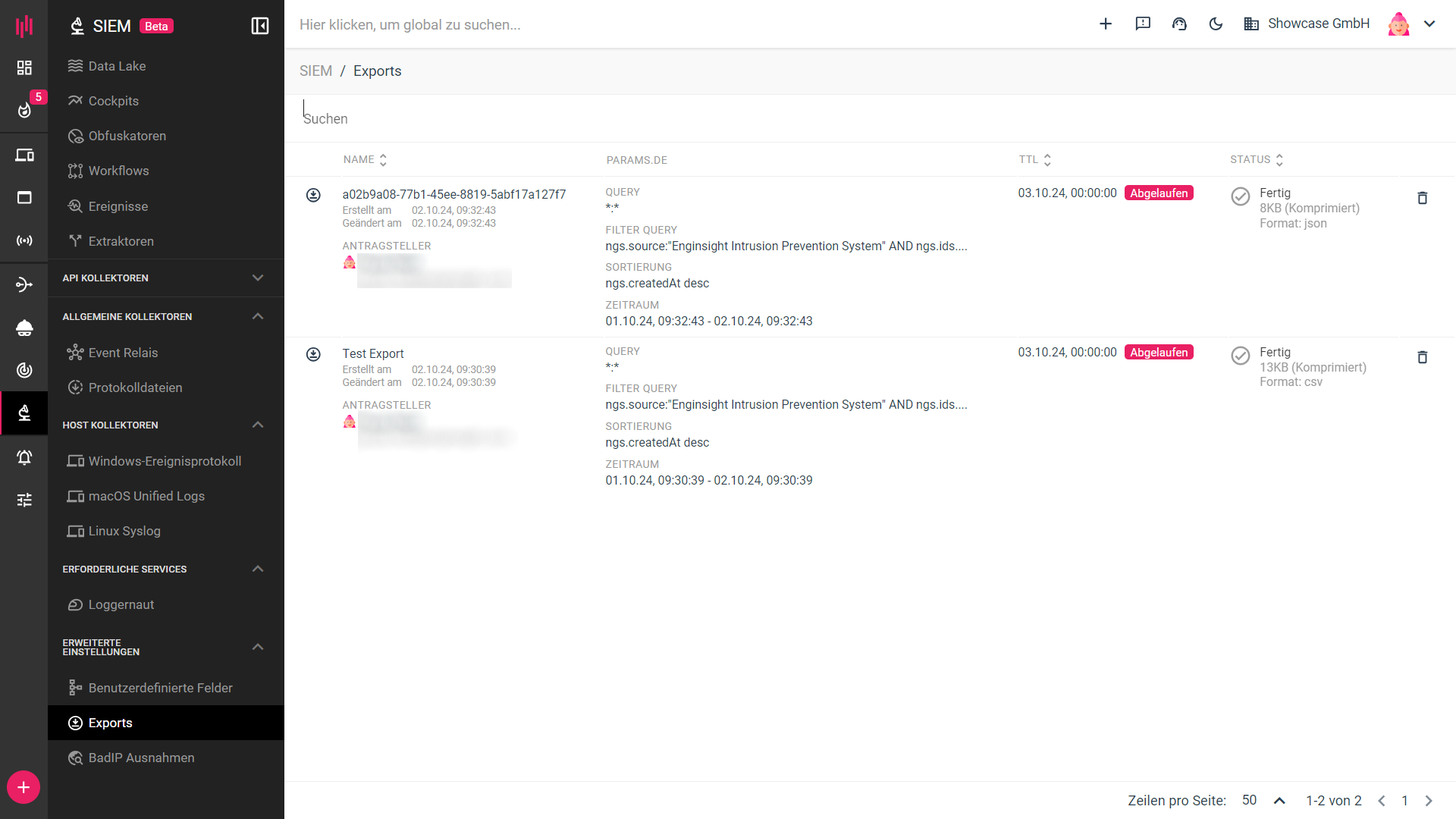 Diese Ansicht ermöglicht es Ihnen, alle aus dem SIEM exportierten Daten an einem zentralen Ort jederzeit wieder aufzurufen, ohne dass eine manuelle Verwaltung nötig ist.