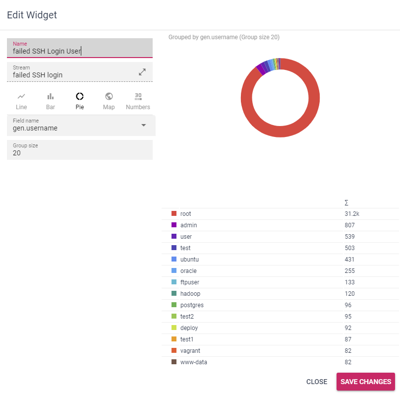 Assign a specific field from the assigned stream to the plot and thus display the 20 most common results within the chart.