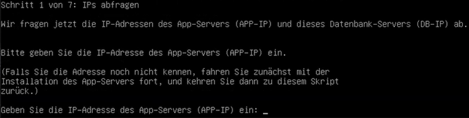 3. Jetzt werden Sie aufgefordert die IP-Adresse Ihres App-Servers einzugeben. Starten Sie nun parallel die Einrichtung Ihres App Servers, um seine IP-Adresse abzufragen.