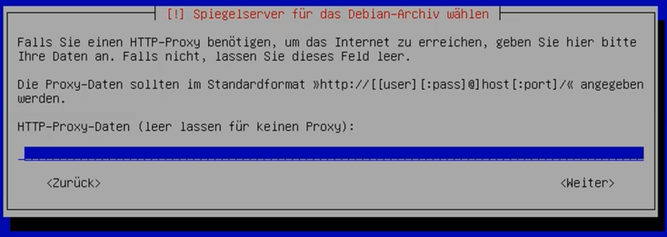 5. Sollten Sie einen HTTP-Proxy einsetzen, konfigurieren Sie die Proxy-Daten im Standardformat. Sollten Sie keinen Proxy benötigen, um das Internet zu erreichen, können Sie die Eingabe leer lassen.