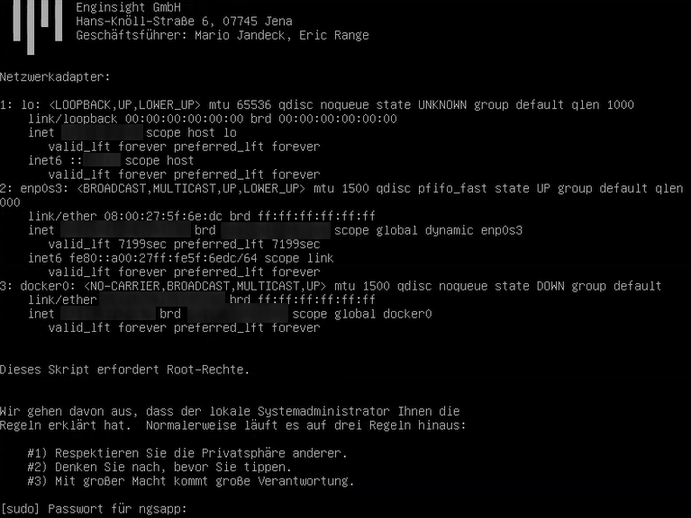 1. Loggen Sie sich anschließend auf Ihrer VM neu ein. Nutzen Sie dafür den zuvor vergegebenen Rechnernamen und das festgelegte Passwort. Da das Skript Root-Rechte benötigt, müssen Sie Ihr Passwort zwei Mal eingeben.